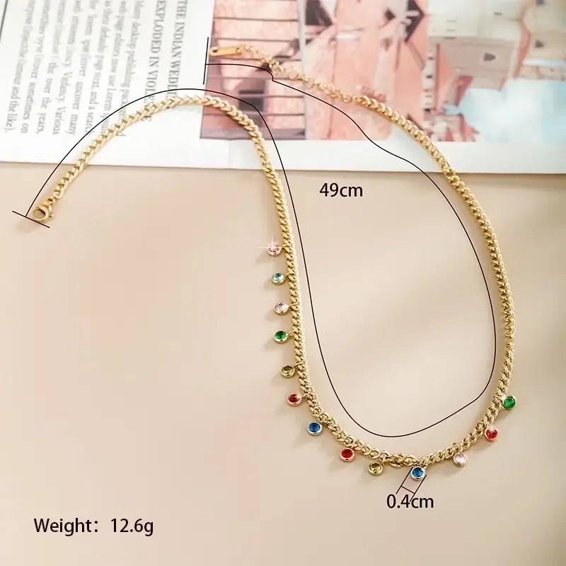 18k gold plated stainless steel necklace with colorful gems.