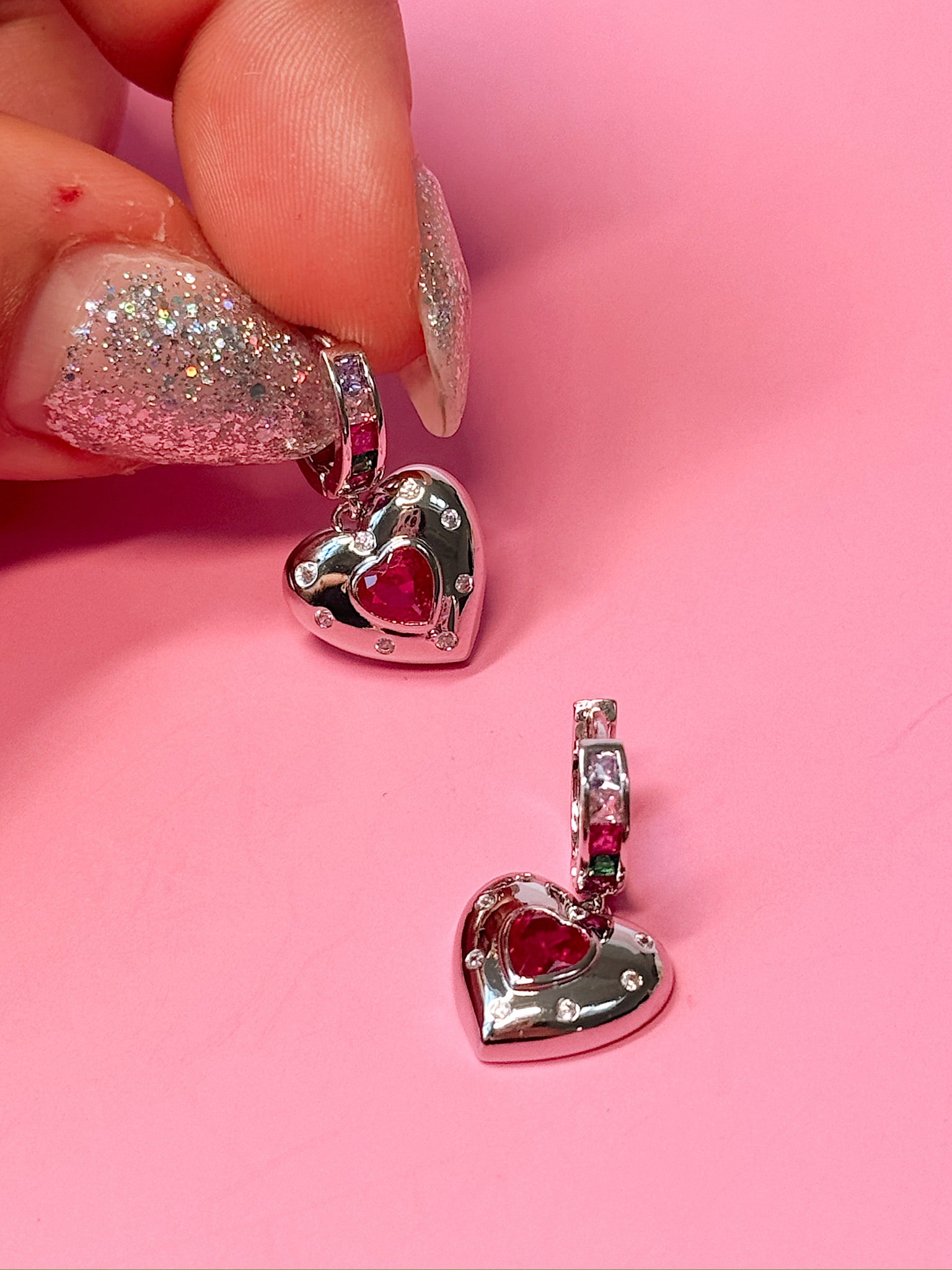 Multi-color bejeweled huggies with hot pink heart gem dangles!