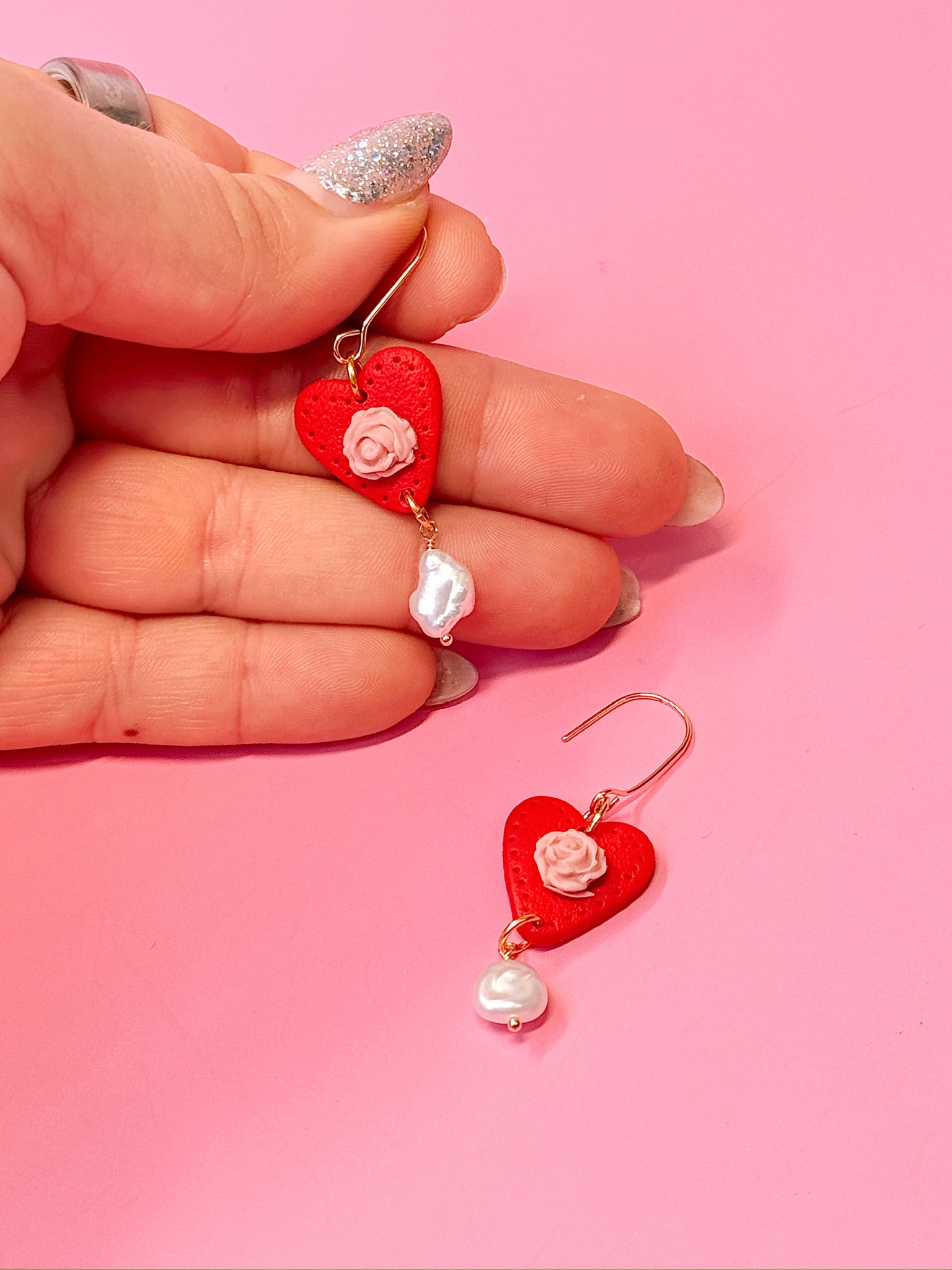 Adorable red heart pendant with a cute pink rose! A natural pearl dangling from the handmade polymer clay pendant adds movement and dangly delight.
