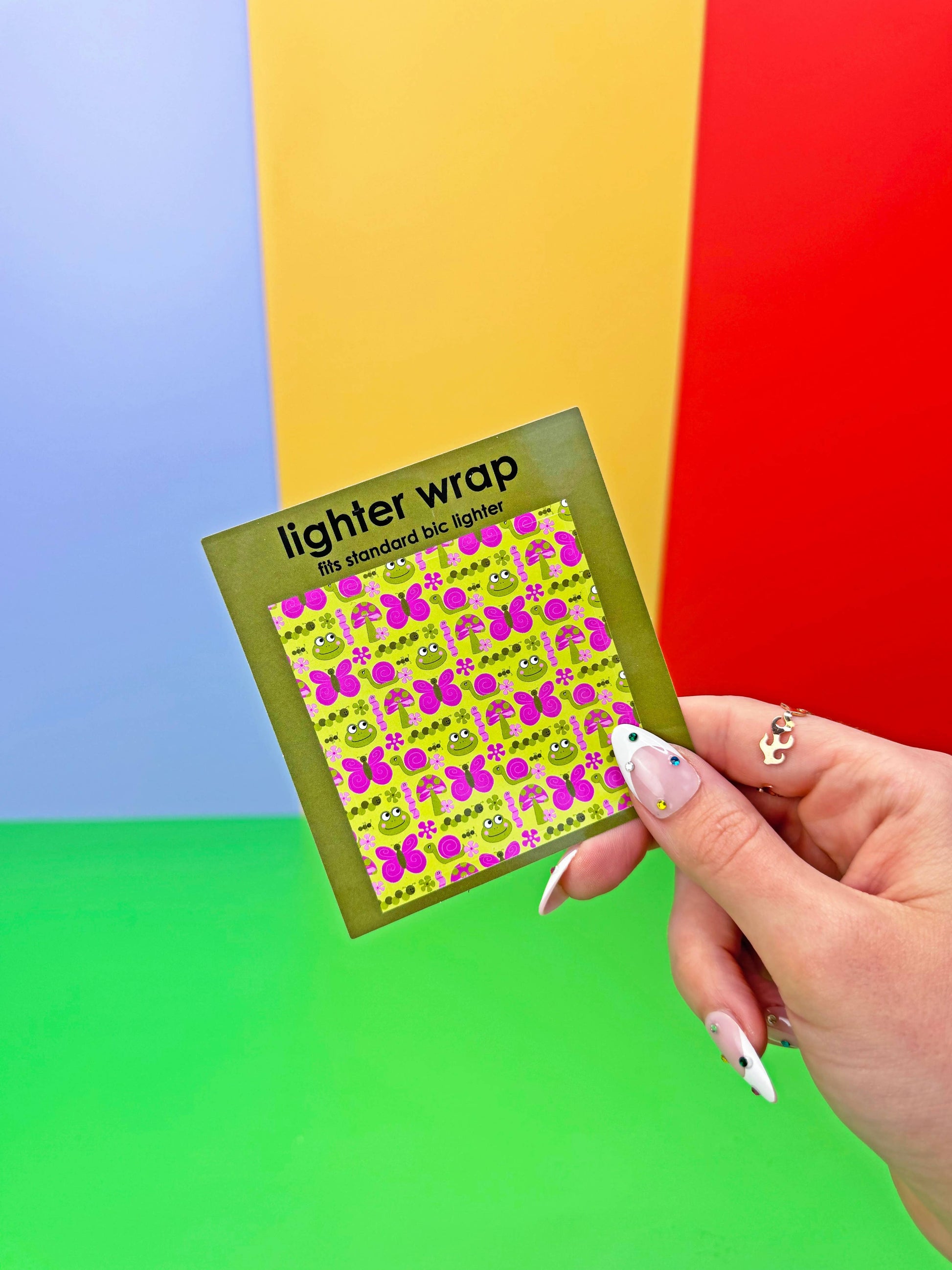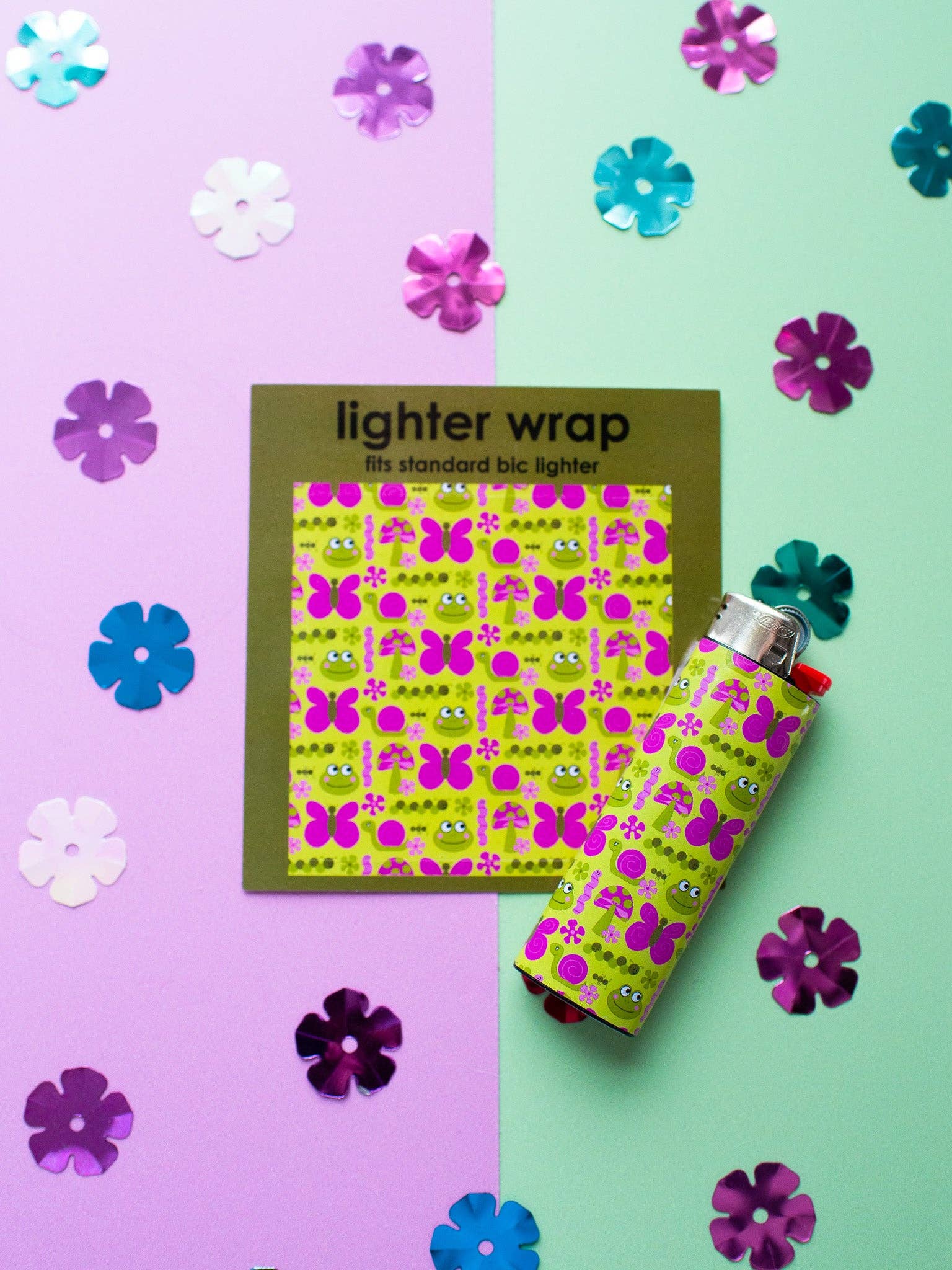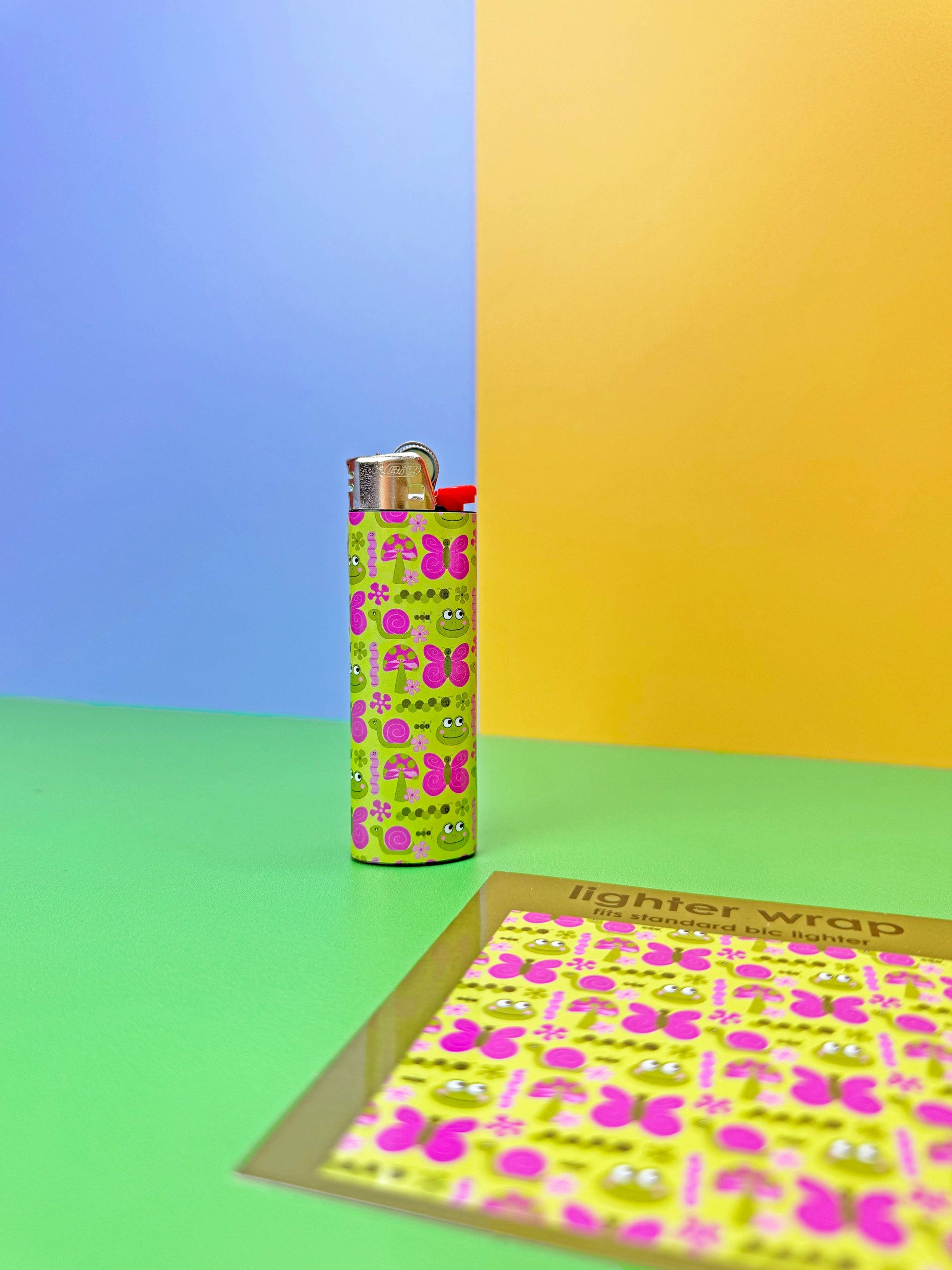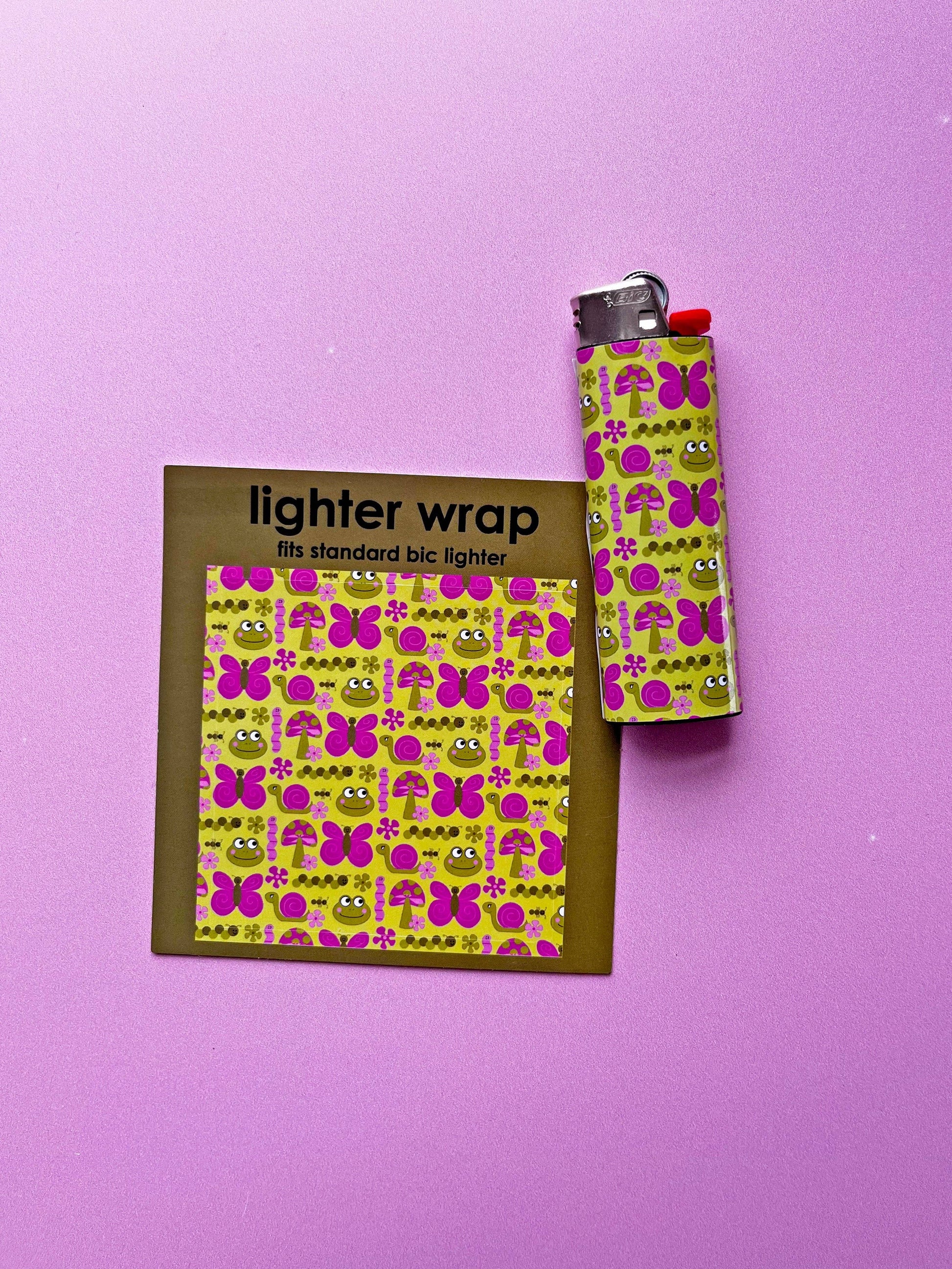 Turn any standard sized Bic lighter into a cute standard sized Bic lighter. If you can use a sticker you can do it!! This lighter wrap features an all over print of cute critters- butterfly, worm, snail, ant, mushroom, and frog, all living together in harmony.