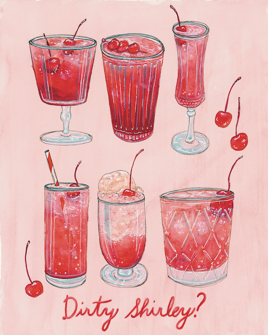 "Dirty Shirley?" is a print of a hand drawn, watercolor painting by ArtxNiki featuring six dirty Shirley cocktails in ornate glassware and the text, “Dirty Shirley?”.