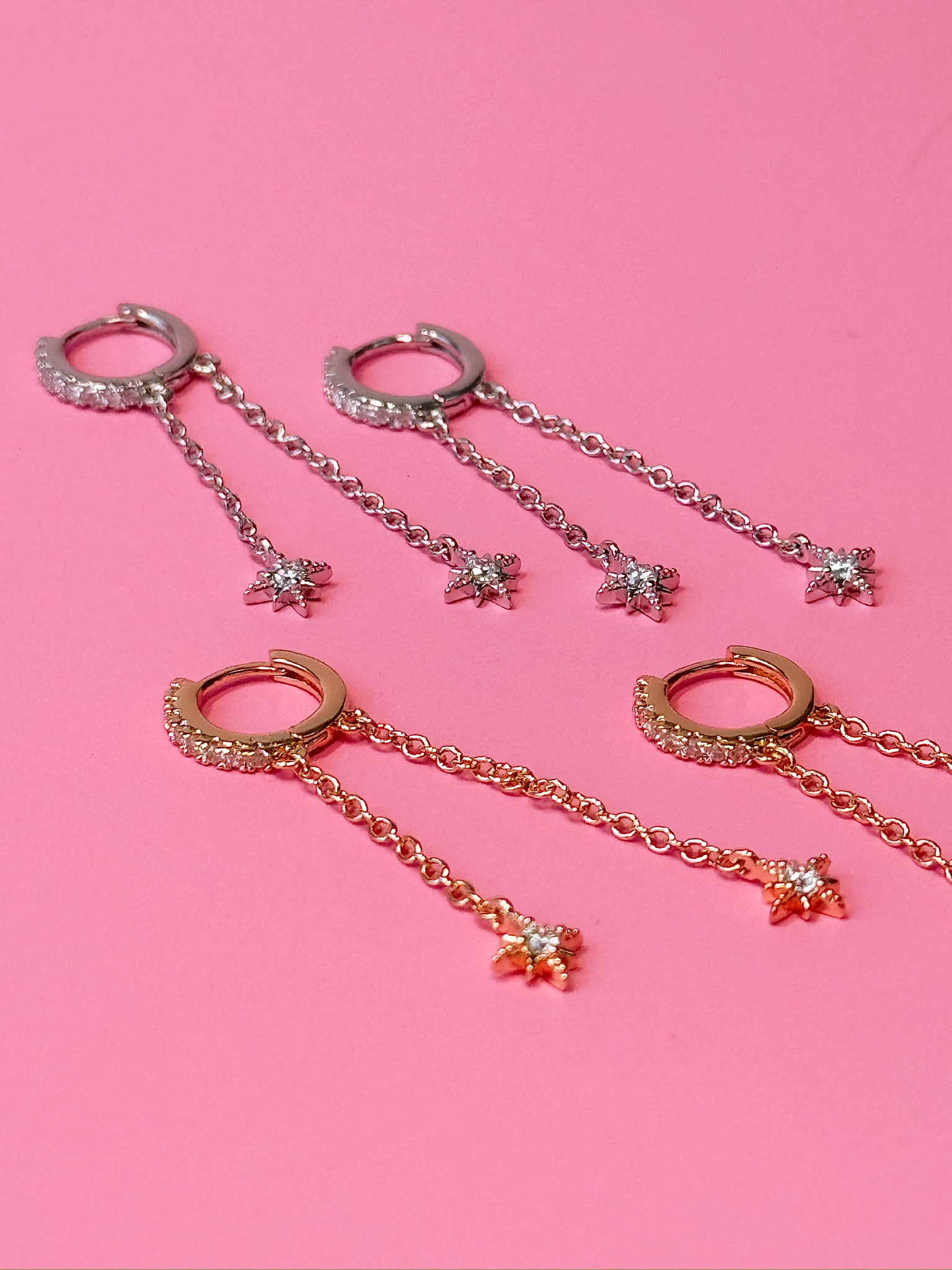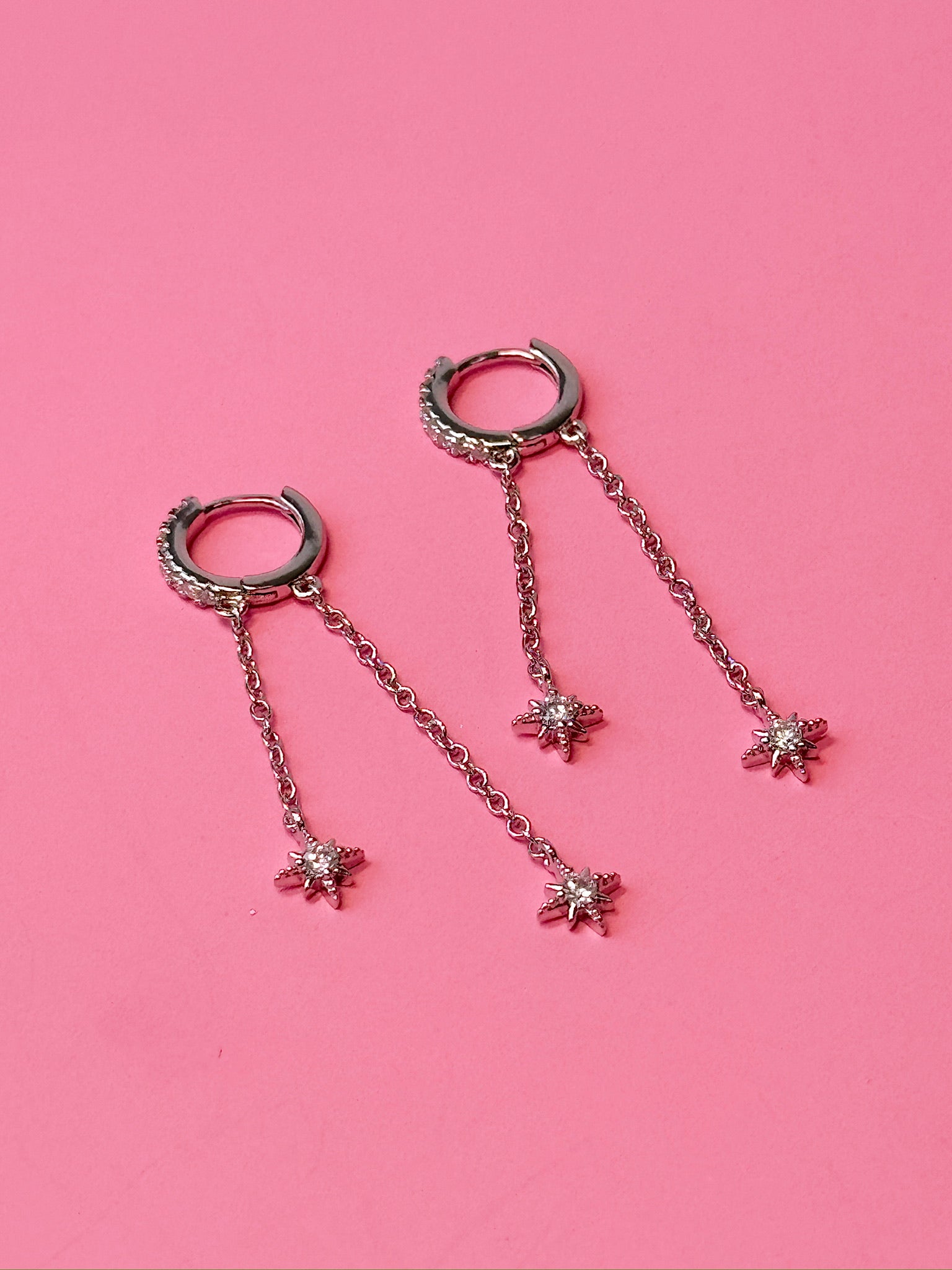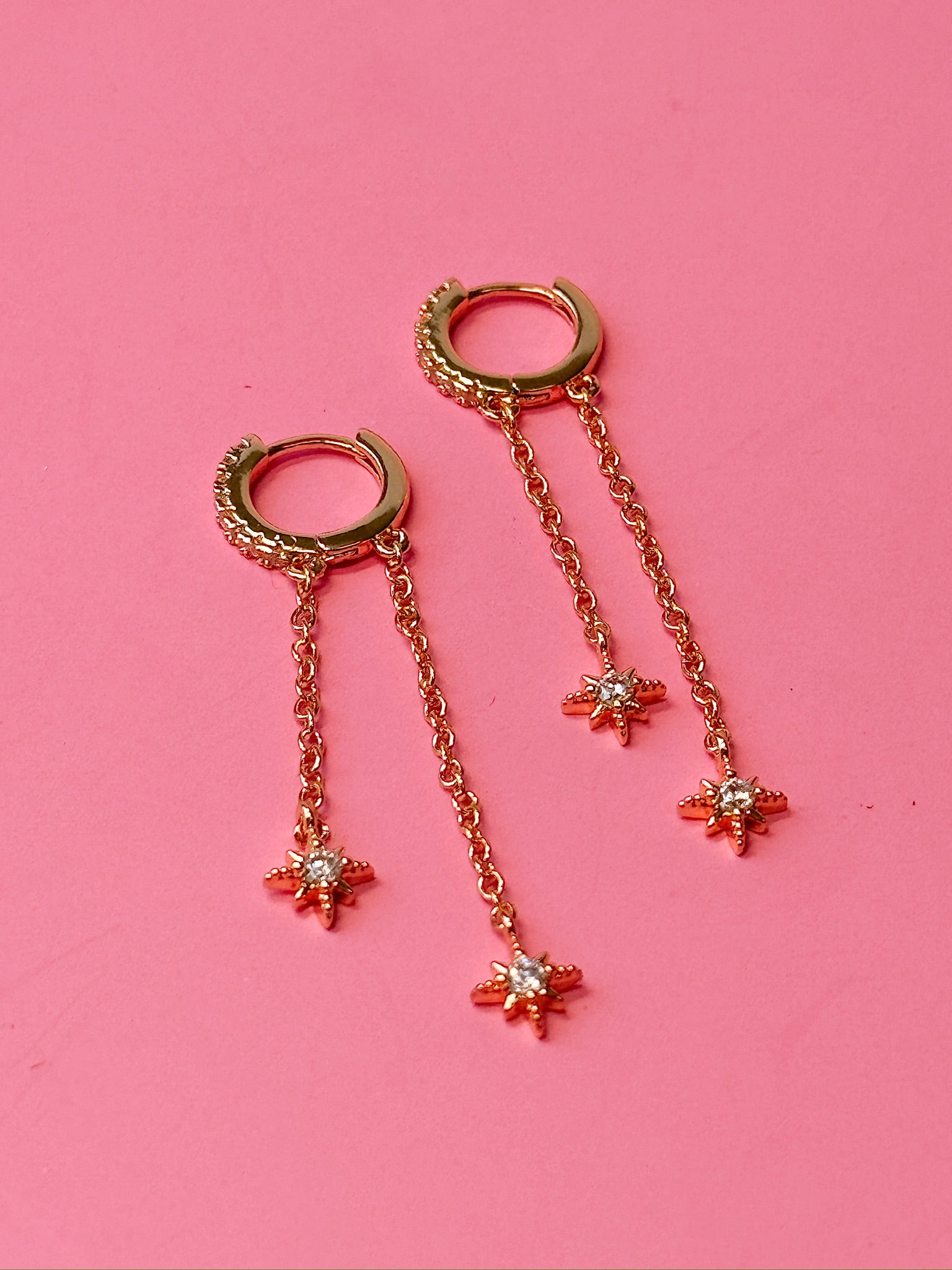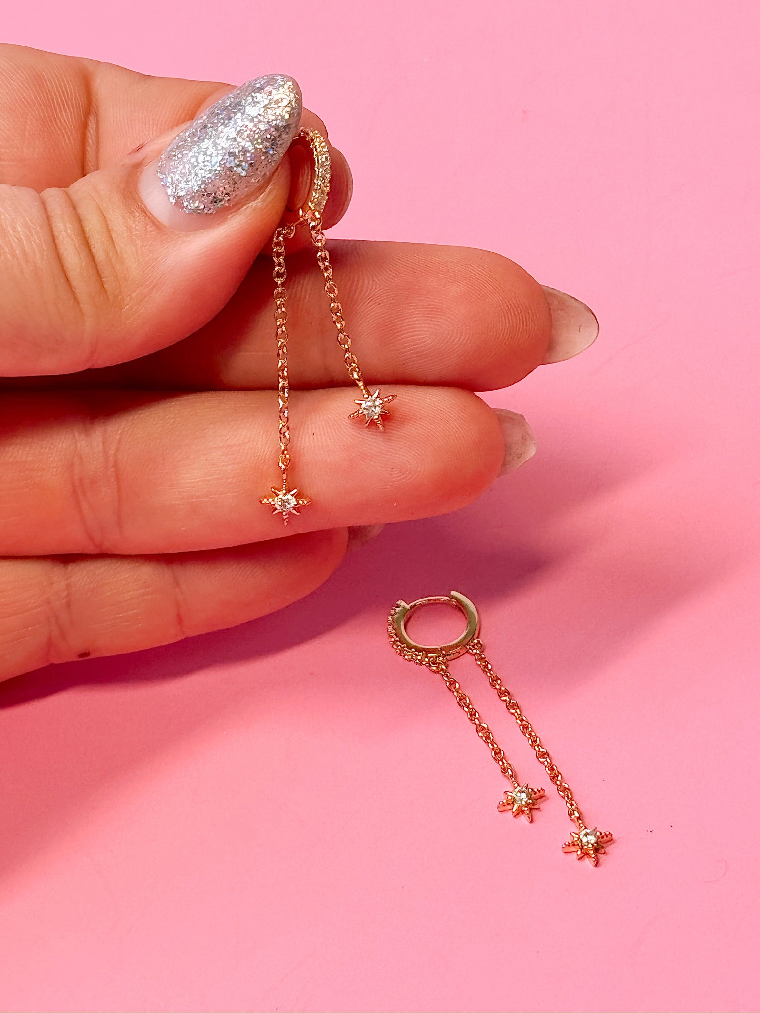 Clear gem embedded huggie with two dainty chain dangles, and little north star charms at the bottom! One chain hangs in front of lobe and one hangs behind to give a super unique and elegent look.