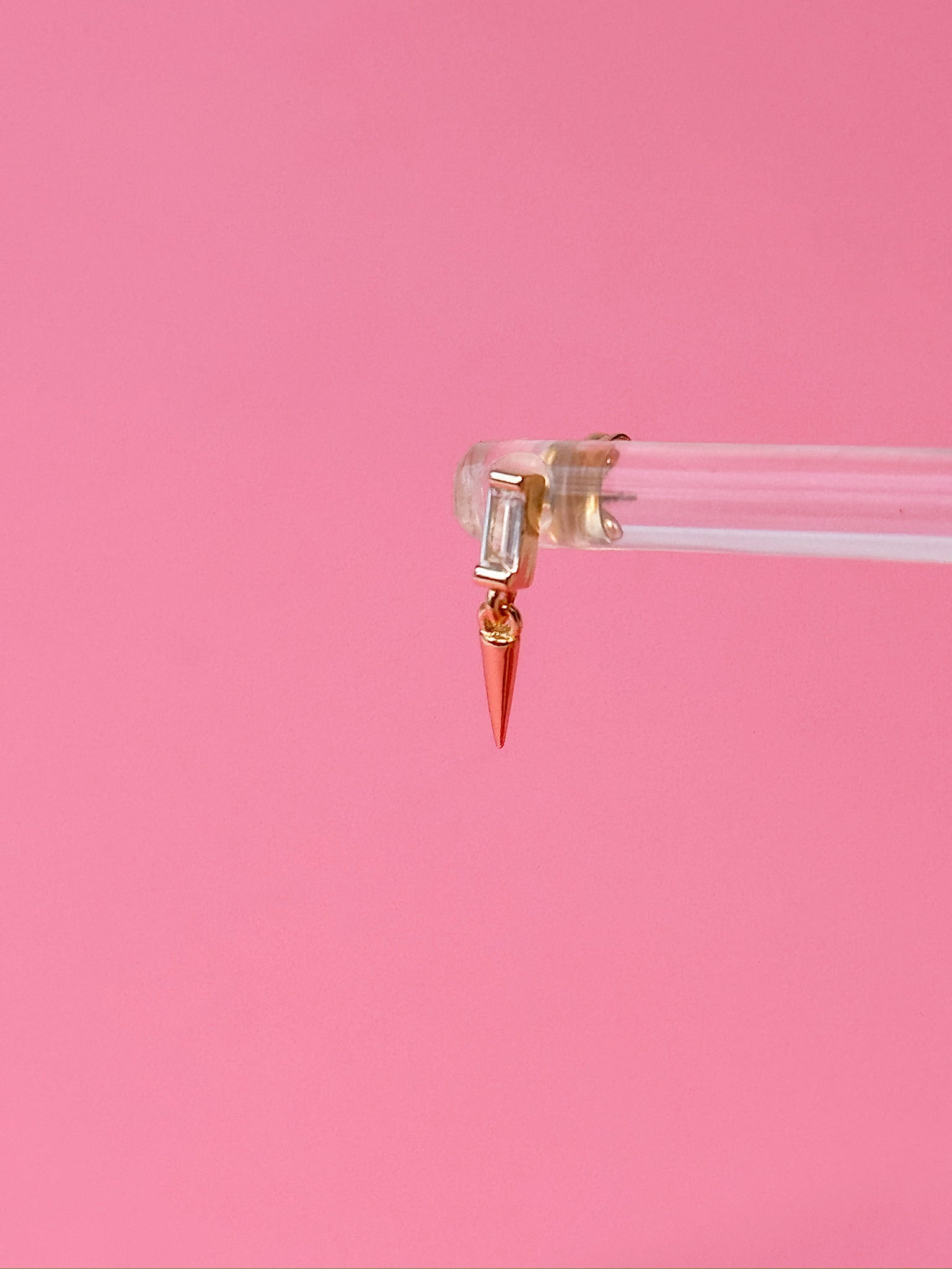 Dainty baguette cut clear jewel stud, with a gold conical spike dangling beneath. It's giving dagger, it's giving edge, it's giving romantasy...