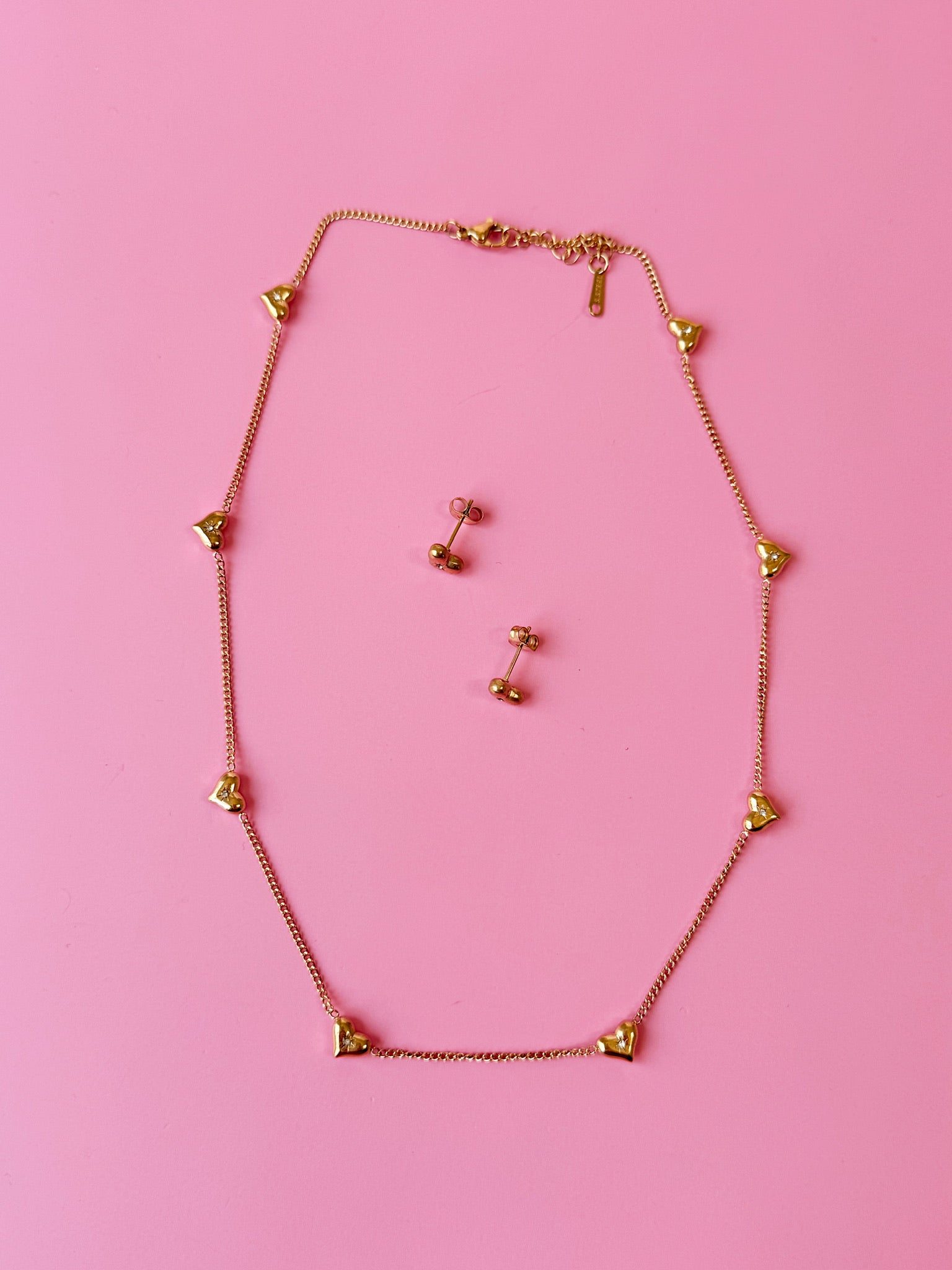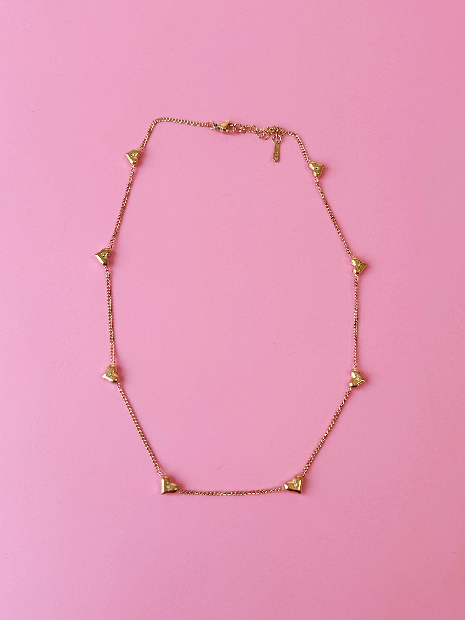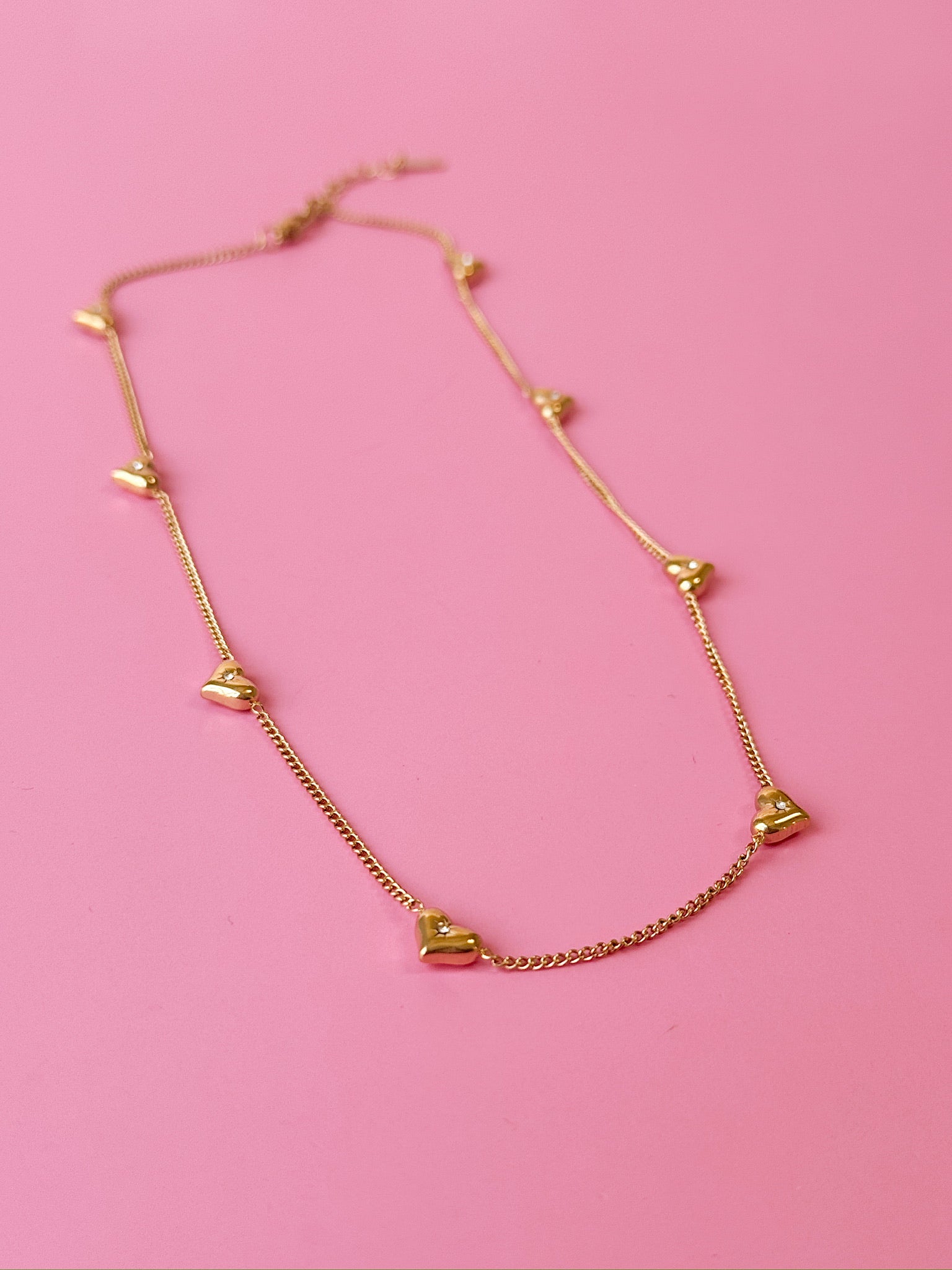 Dainty gold chain with Love Club hearts suspended throughout! Each heart charm has a CZ gem!