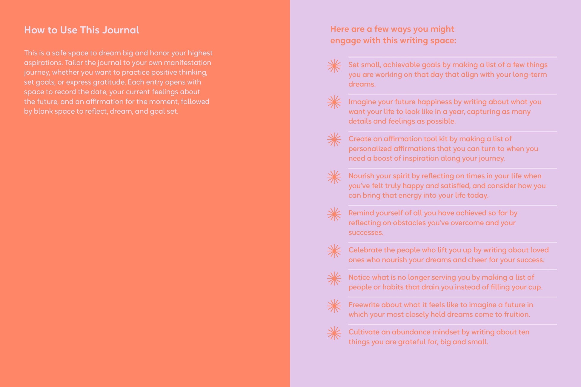 Inviting and brightly designed, this fill-in journal can be tailored to your own manifestation journey, whether you want to practice positive thinking, set goals, or express daily gratitude.