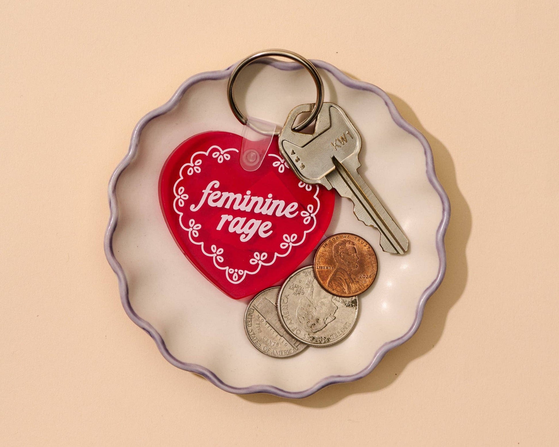 • Keychain reads, " Feminine Rage" on a lacy heart