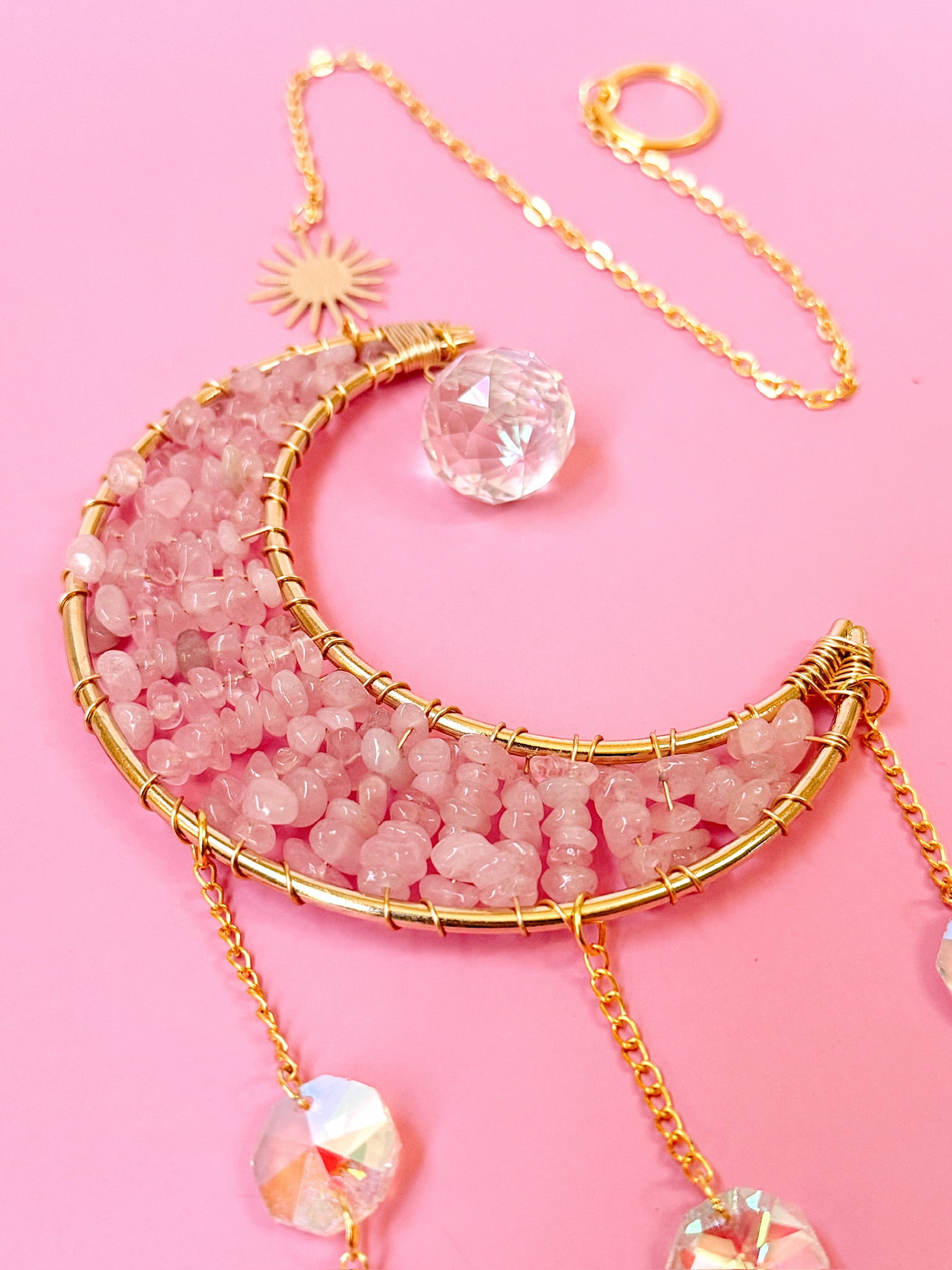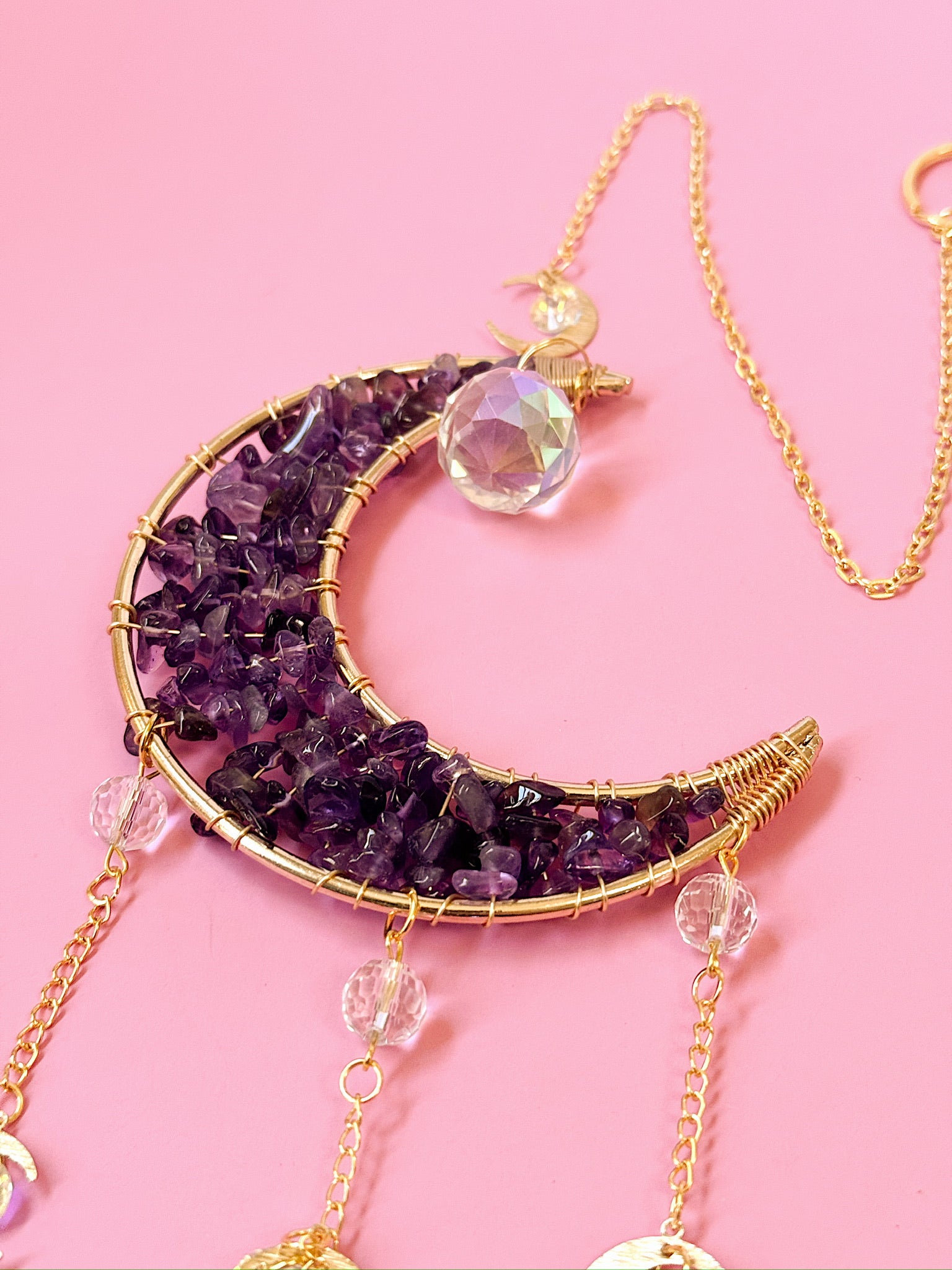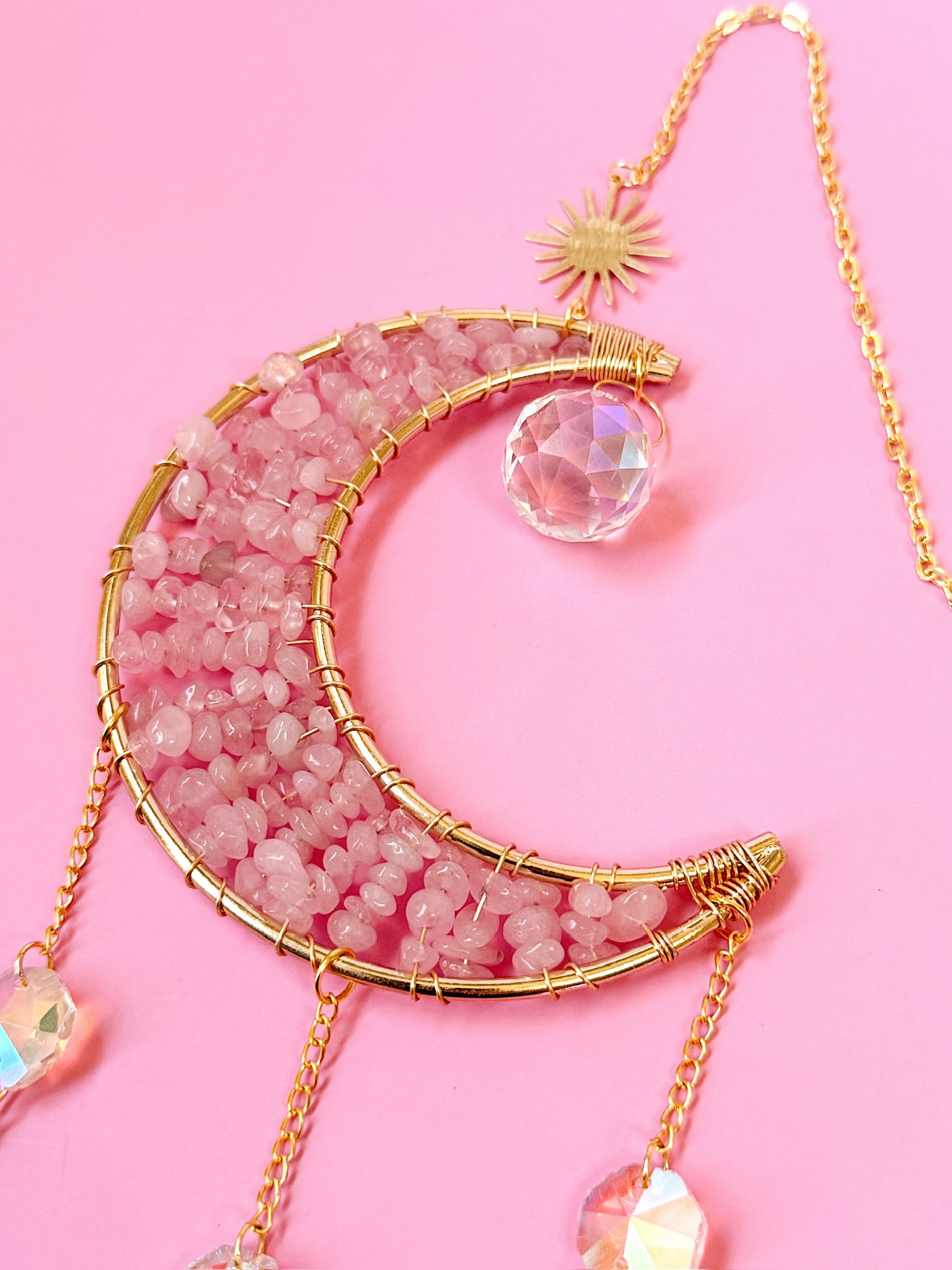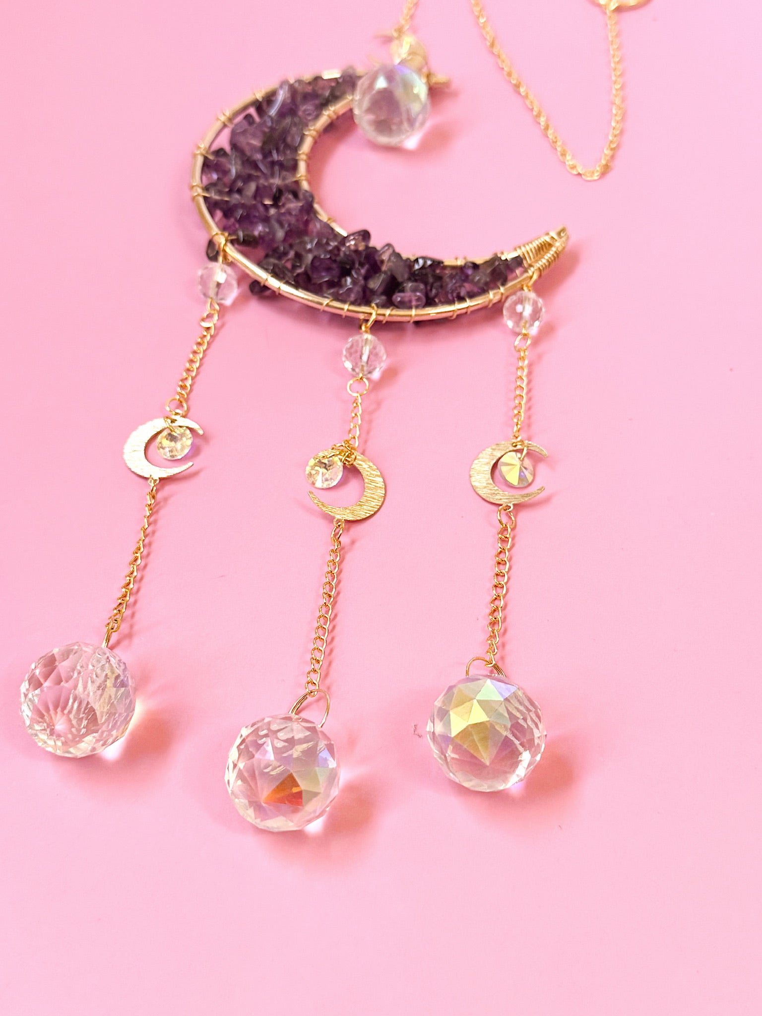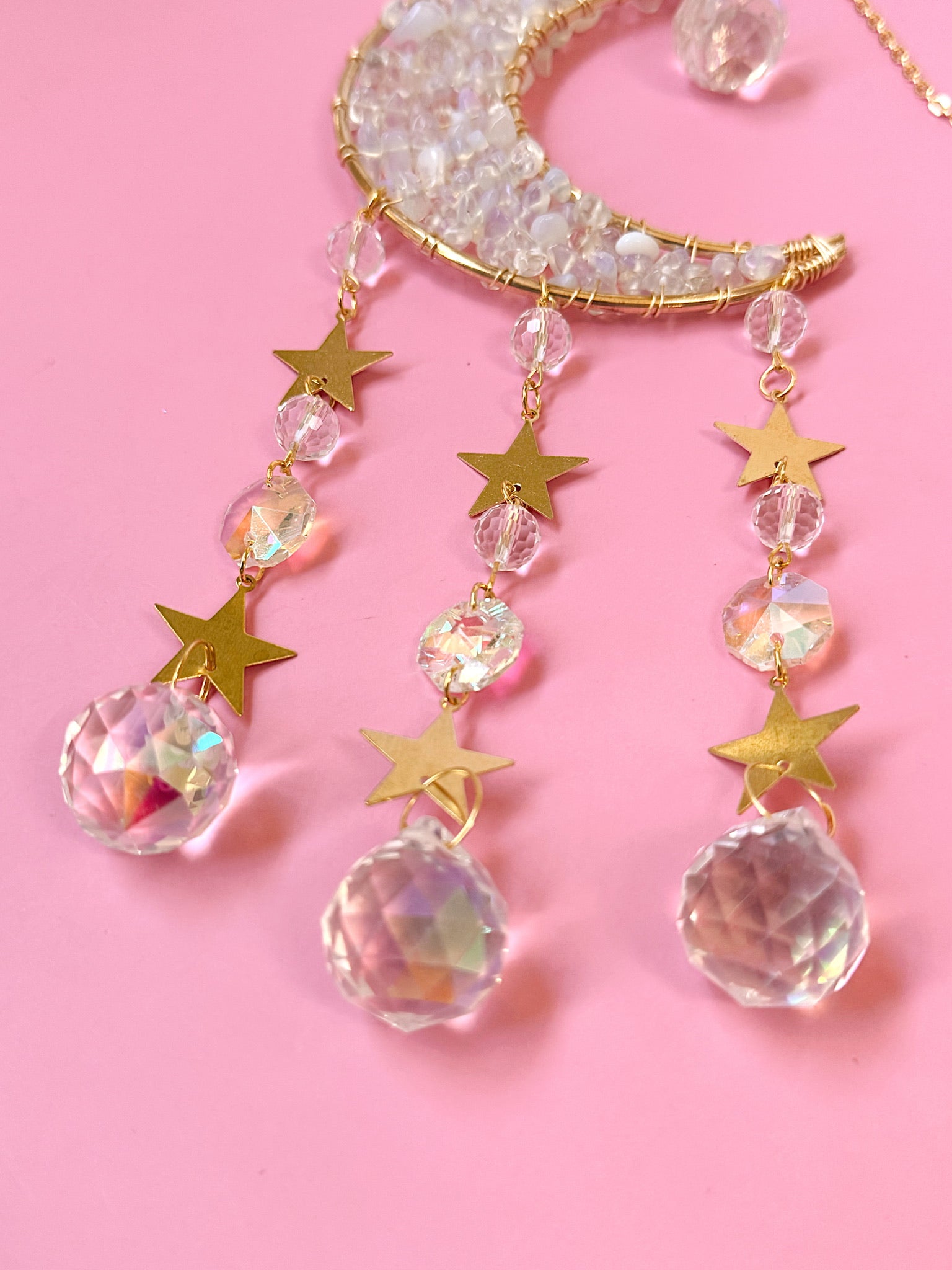 Bring a touch of magic to your window with the Moonshine Suncatcher. This beaded crescent moon has crystal dangles that catch the light and dance with color throughout the day. Perfect for adding whimsy and charm, it turns any sunny spot into a little celebration of light and play. Let your space shine with celestial joy!