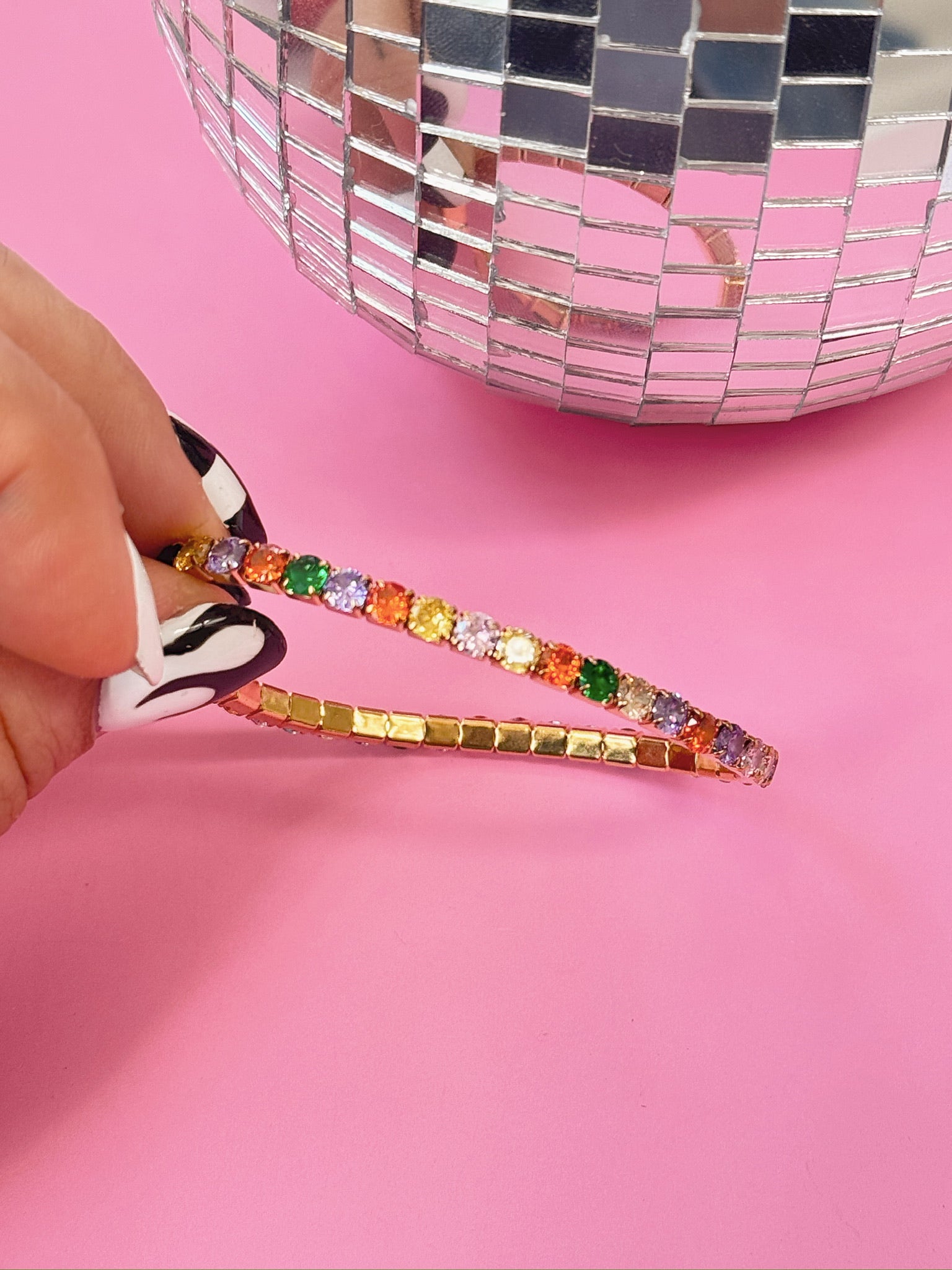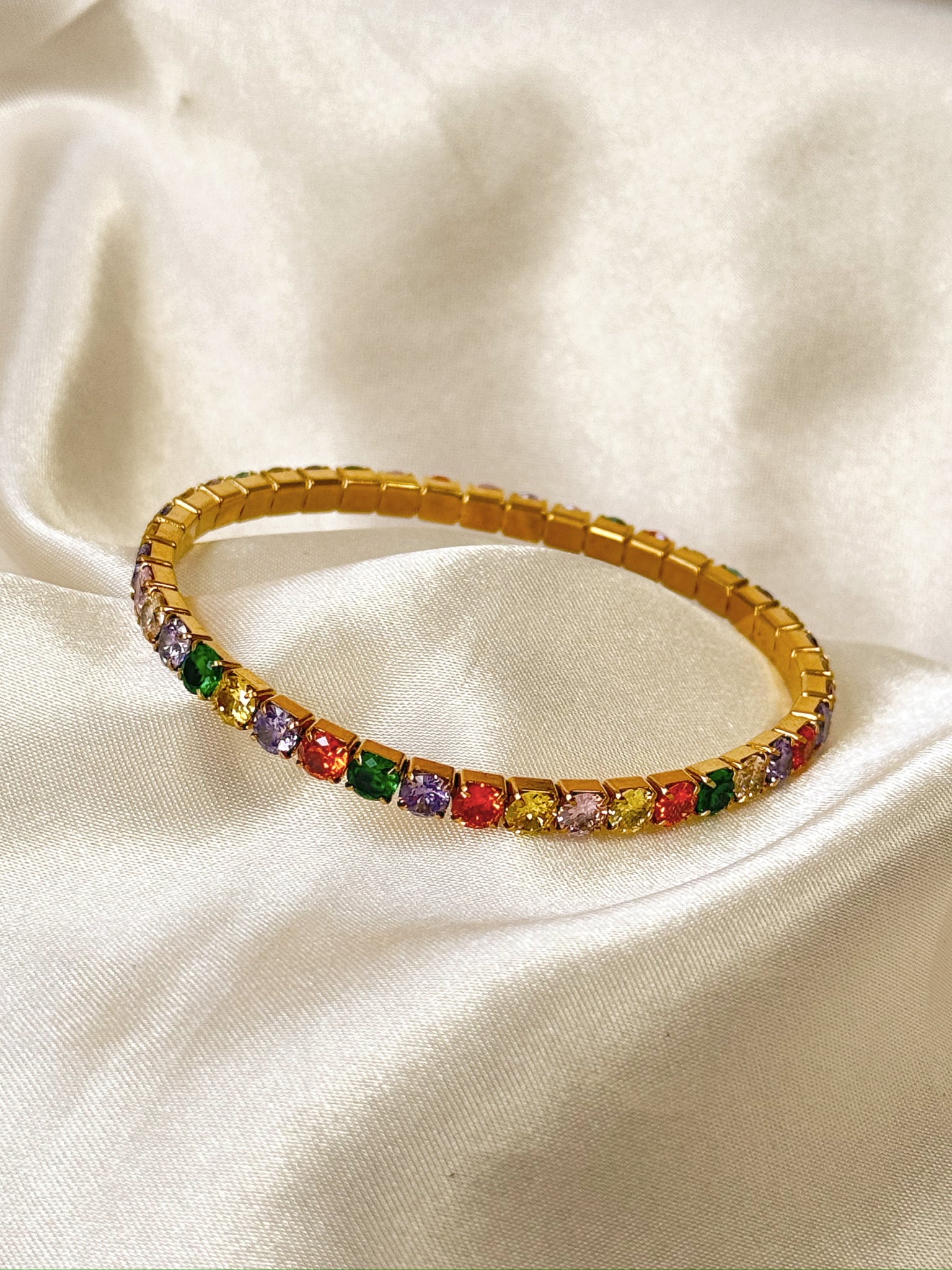 Meet your new go-to accessory! This expandable rainbow gem bracelet brings just the right amount of sparkle without the fuss. Its funky minimalist aesthetic makes it perfect for layering or wearing solo, while the expandable fit means it's easy to slip it on and glow.