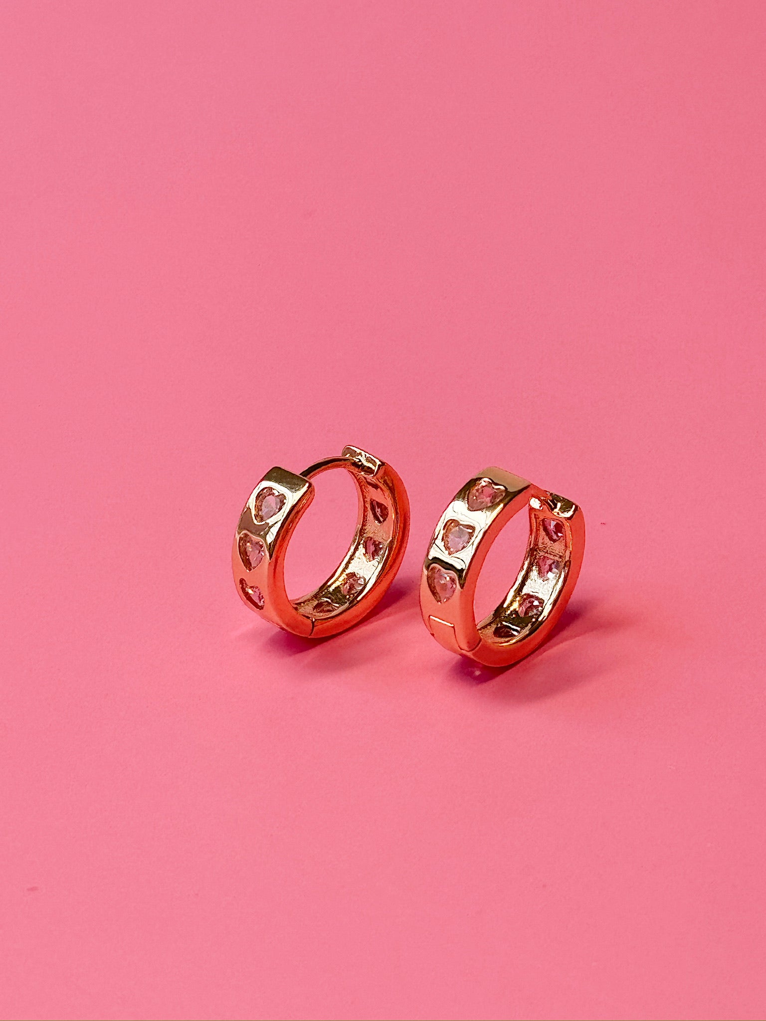 Gold band hoop with cute light pink heart shaped gems throughout! Hinged clasp allows for easy wearability.