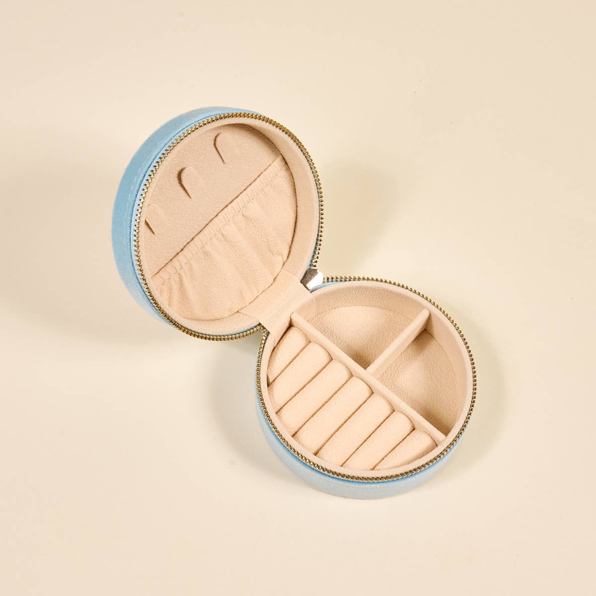 On the outside, this case features a stunning embroidered design and gleaming gold zipper hardware. Inside, you'll find 5 slots for rings or earrings, an interior lid pouch, and open storage space for larger pieces. Made with soft velvet featuring an elegant embroidered top